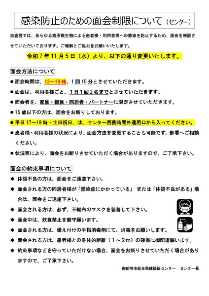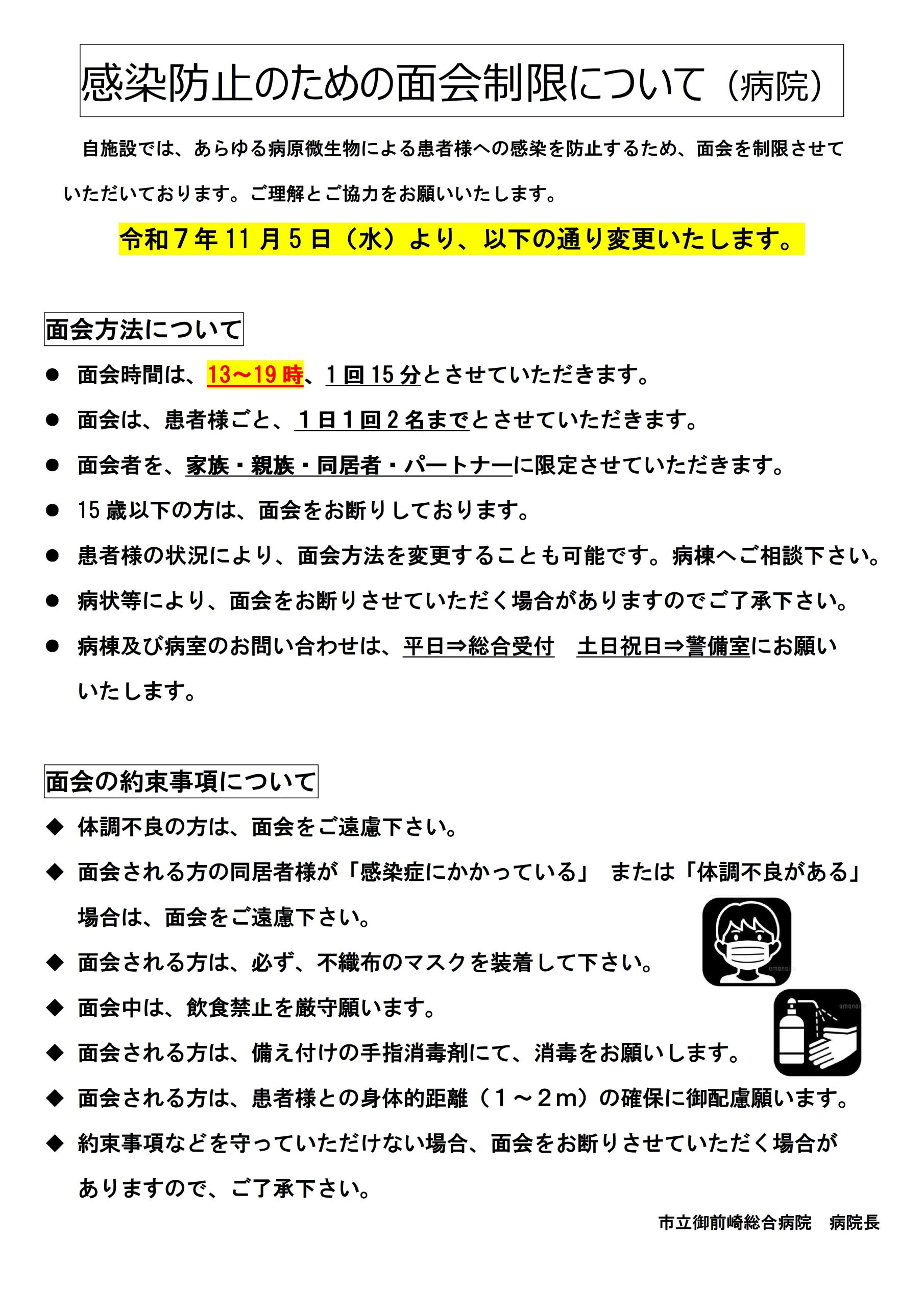 面会について(制限させていただいています) 令和7年11月5日~ 1 面会予約:不要 2 面会時間:13時~19時(1日1回15分以内、2名まで、土日祝日同じ) 3 面会者 :家族・親族・同居者・パートナーに限定させていただきます。 (体調不良の方や15歳以下の方は面会できません) 4 その他 :不織布マスクを装着してください。病室内等での飲食不可。 面会前に、病棟で問診票を記載し、提出してください。 ご理解とご協力をお願いいたします。 【市立御前崎総合病院】 【御前崎市総合保健福祉センター】