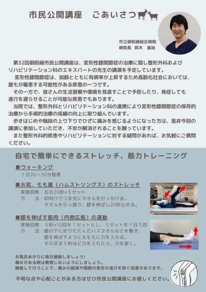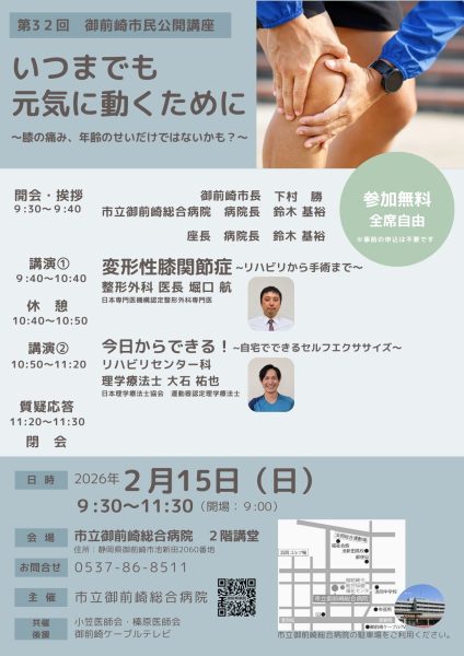 第32回御前崎市民公開講座のお知らせ 2026-01-09 第32回御前崎市民公開講座を開催します。 膝の痛みにお悩みではありませんか? その痛み、年齢のせいだけではないかもしれません。 今回の公開講座は、「変形性膝関節症」をテーマとし、 当院の医師・理学療法士が、わかりやすく解説します。 ご自宅でできる簡単な運動も紹介しますので、この機会にぜひ足をお運びください。 皆さまのご来場をお待ちしております。 ◆日時:2月15日(日) 9:30~11:30 ◆会場:市立御前崎総合病院 2階講堂 詳細は、下記のチラシをご覧ください。